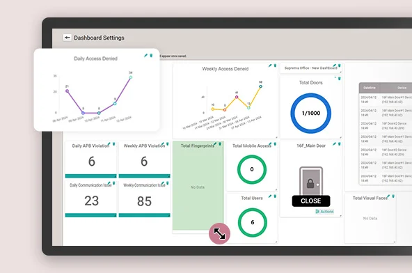 • Nowoczesne pulpity (dashboardy) z możliwością konfigurowania widgetów (np. liczba zdarzeń, stan drzwi, wykresów).