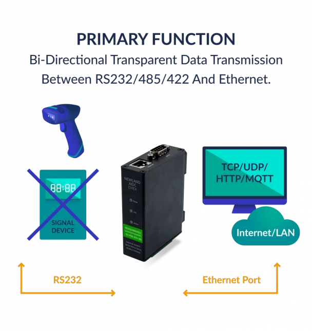 Newland EX232 Remora to zaawansowany moduł komunikacyjny, który rozszerza możliwości skanerów kodów kreskowych wyposażonych w port RS232, umożliwiając ich integrację z infrastrukturą Ethernet. Dzięki temu można bez wymiany sprzętu podłączyć istniejące stanowiska pracy do sieci, zwiększając ich funkcjonalność oraz efektywność.